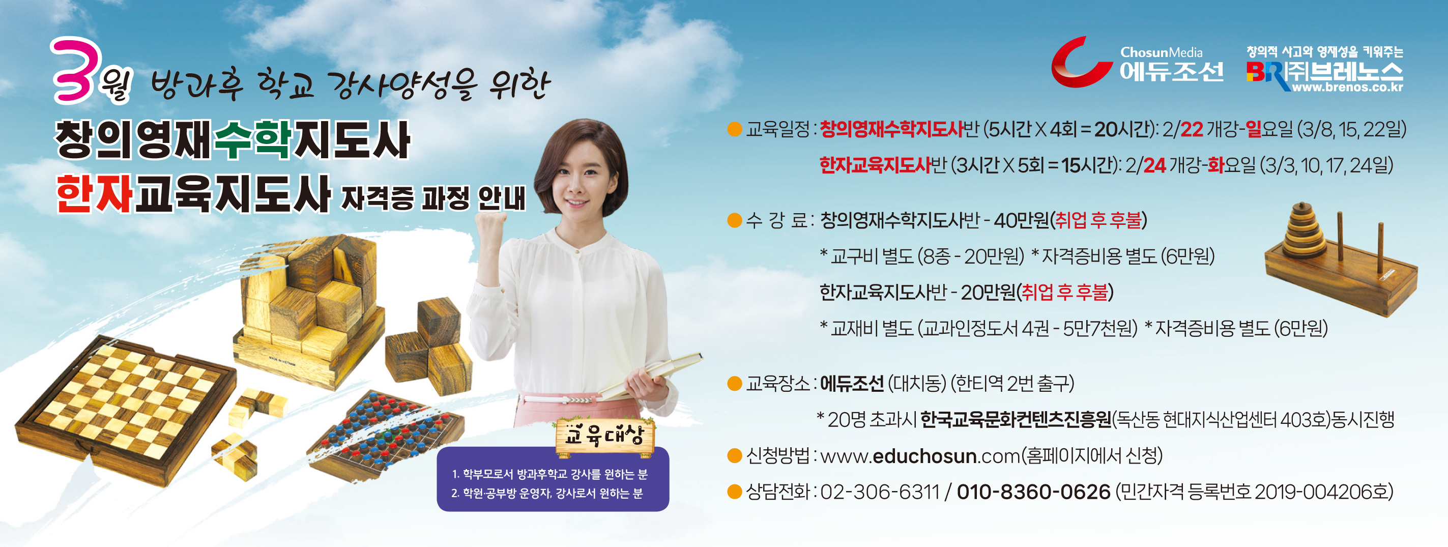 (주)에듀조선 회사소개 CEO인사말 개요 및 연혁 오시는 길 어린이조선일보 NIE교육·강좌 사업영역 어린이조선일보 뉴지엄/기자체험 NIE교육 레인보우키즈스쿨 교육사업 및 이벤트 협업문의 교육문의 사업제휴 광고문의 결제 공지사항 공지사항 갤러리 프로그램 안내 결제 협업문의 결제 창의영재수학지도사반 400,000 내용 결제는 강사활동 시작 후, 후불입니다 :) 가격 400,000 상세 이미지 구매하기 주문 정보 입력 이름 연락처 이메일 개인정보 수집 및 이용에 동의합니다 결제하기 상담하기 TOP